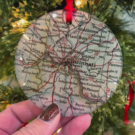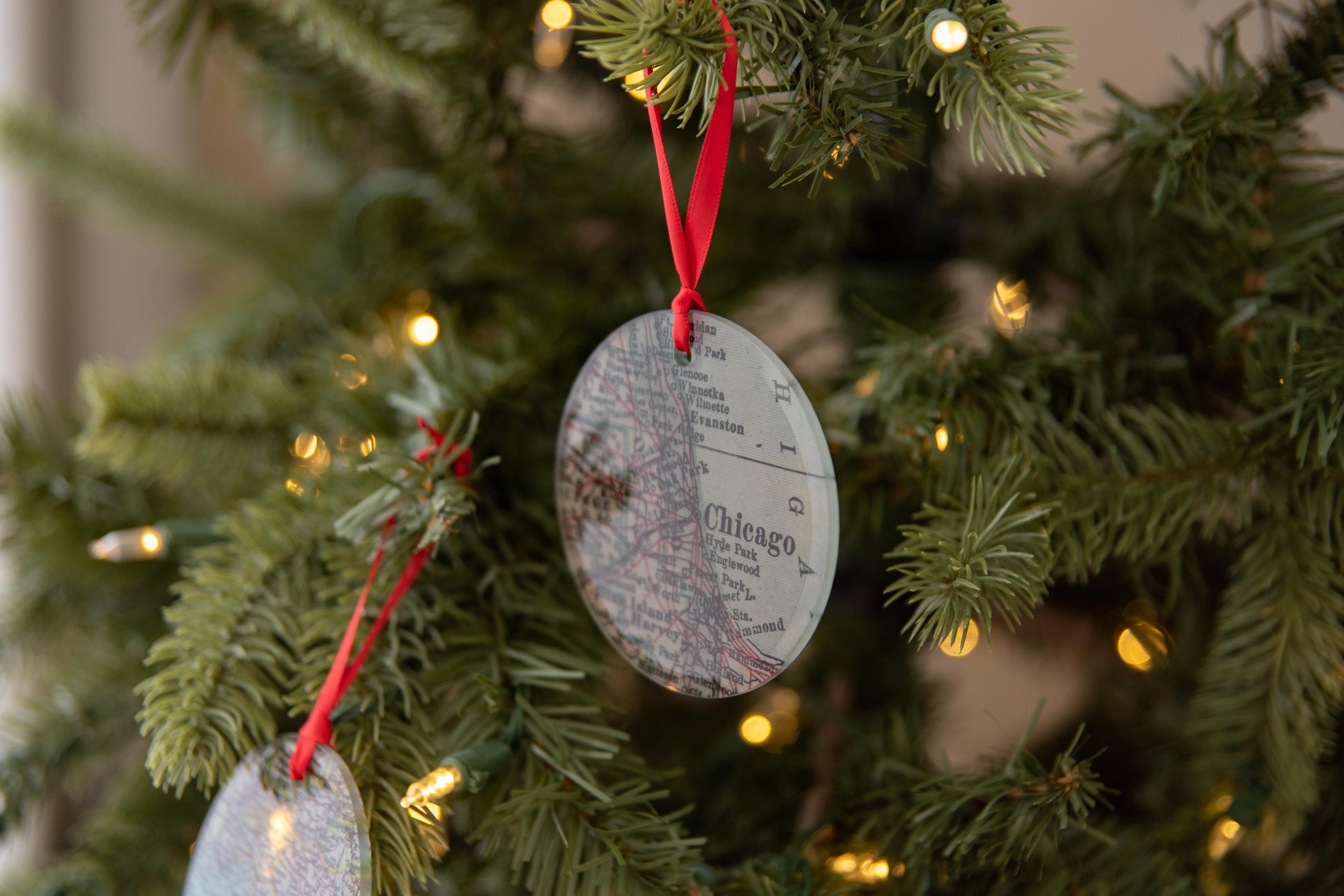 Each ornament is designed and printed by hand in our Columbus, Ohio studio using maps from our in-house vintage collection.