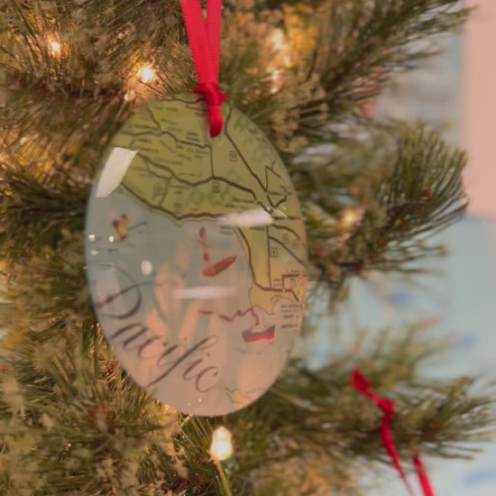 Our Custom Frosted Glass Map Christmas Ornaments feature vintage map imagery selected just for you — a hometown, favorite travel destination, lake, college town, or place full of memories. Printed on softly frosted glass, this ornament has a classic, heirloom feel that looks beautiful on the tree year after year.