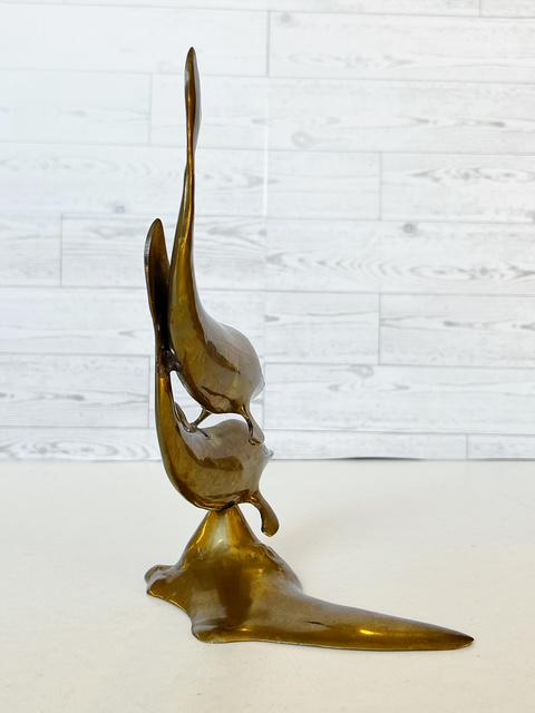This vintage solid brass dolphin sculpture captures classic mid-century modern style with a coastal twist. Featuring two dolphins in motion, this substantial piece has beautiful weight and presence, making it a standout accent for shelves, consoles, or styled bookcases.