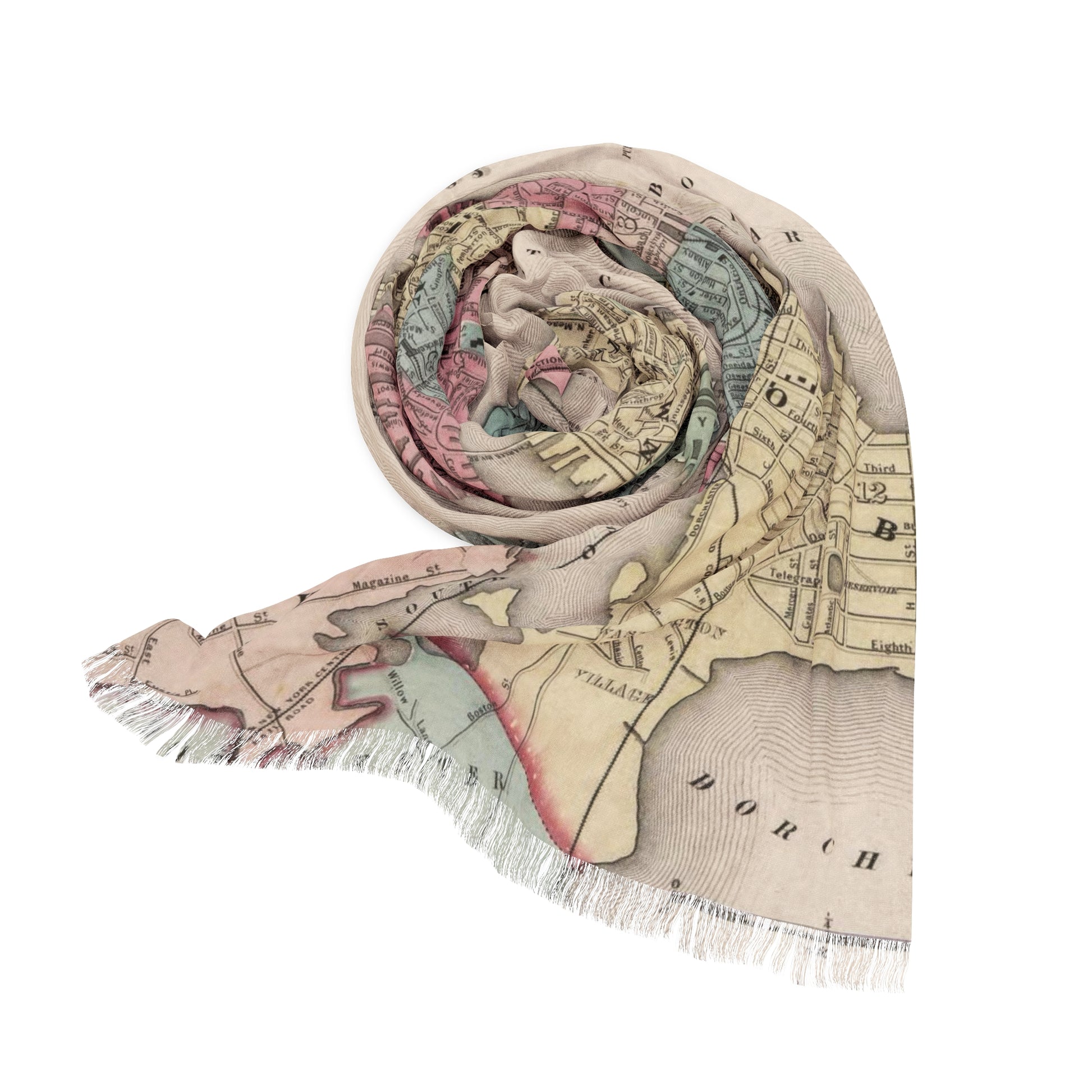 Featuring a vintage Boston city map, this scarf highlights the neighborhoods and pathways that define the city. It is lightweight, easy to style, and designed to add subtle character without feeling loud or novelty driven.