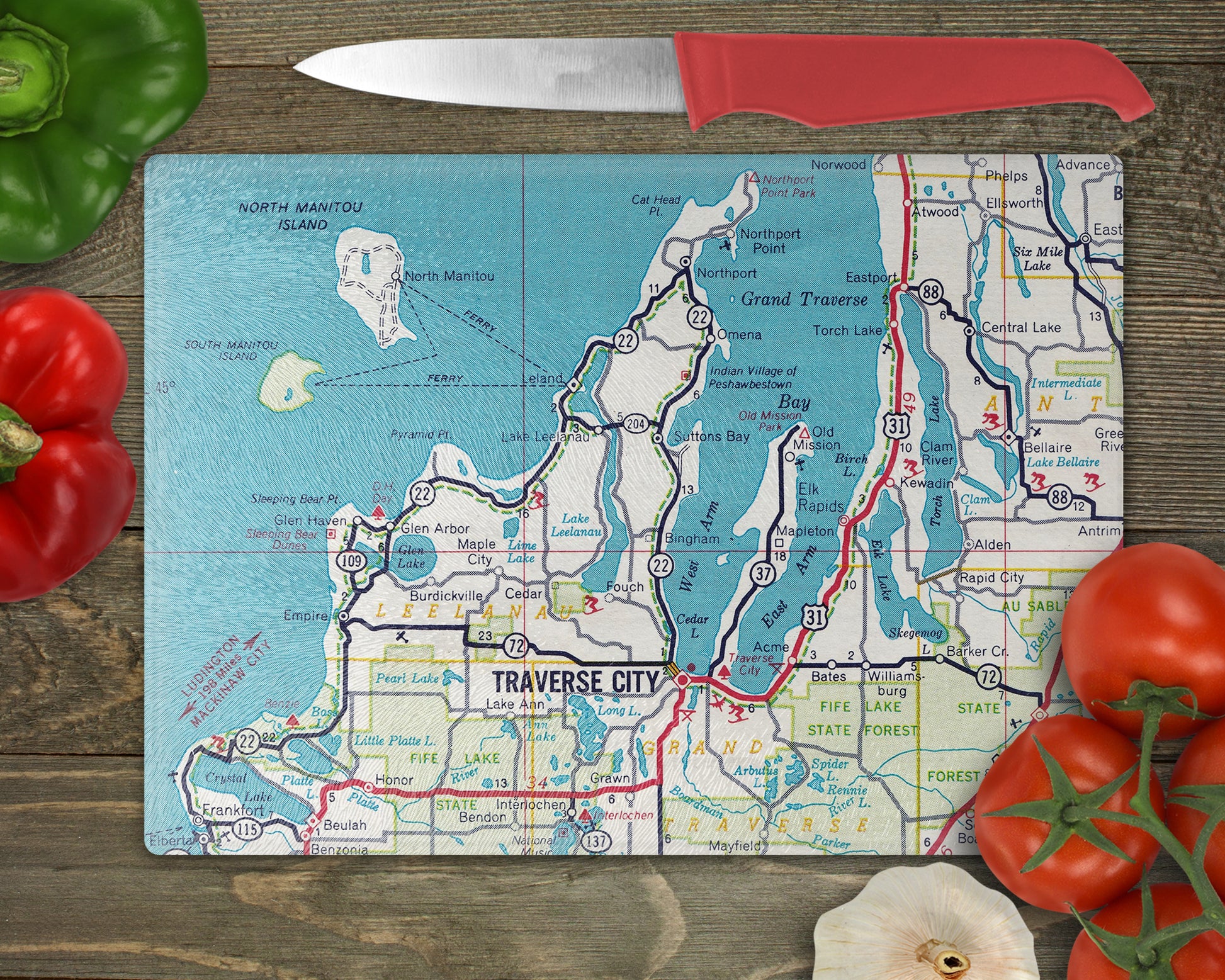 Bring Northern Michigan into the heart of your kitchen with this Traverse City map cutting board, featuring a detailed vintage-style map of Traverse City and the surrounding Grand Traverse Bay region.