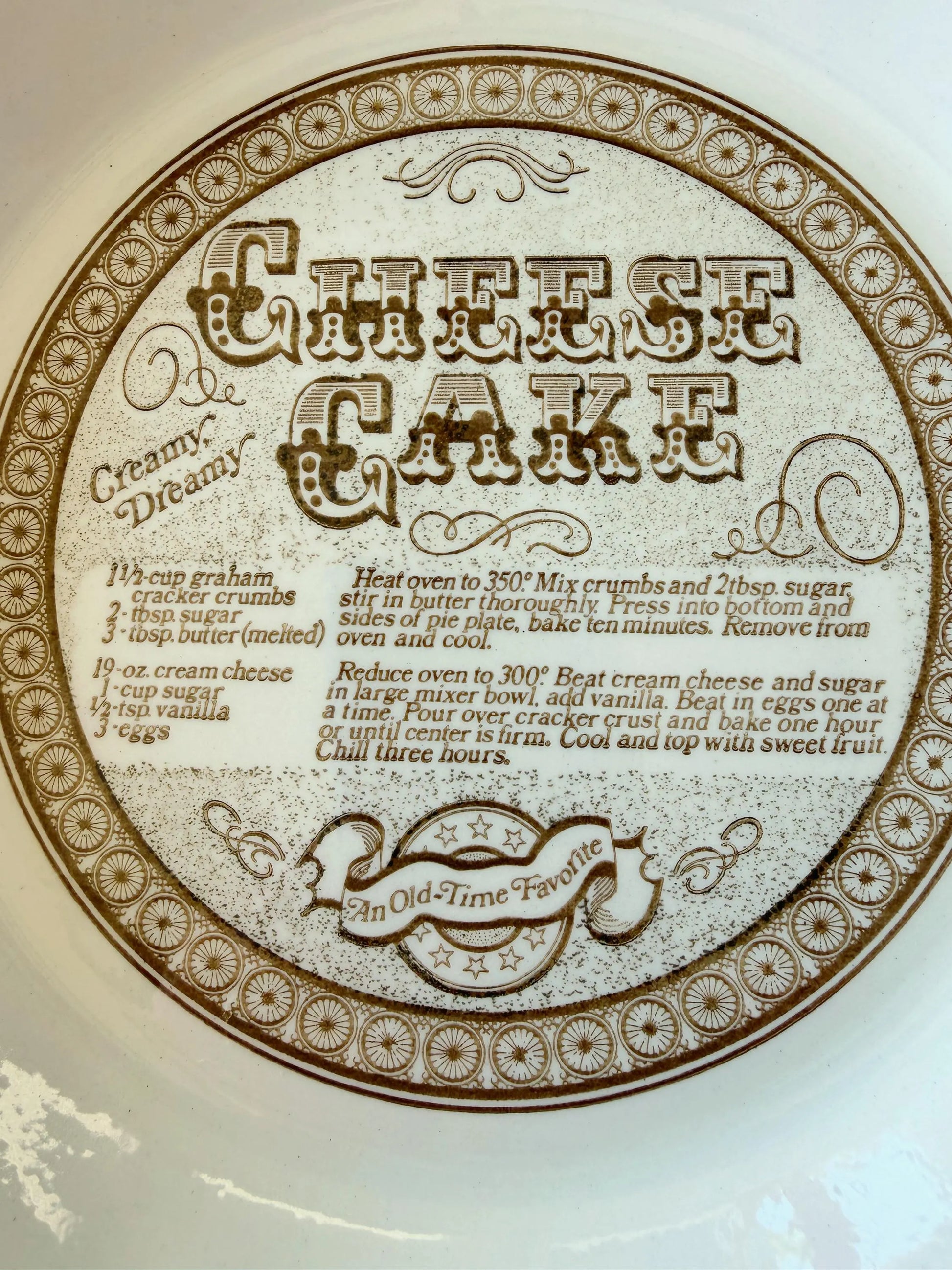 A classic piece of retro kitchen charm, this vintage “Cheese Cake” recipe pie dish was made by Royal China by Jeannette in the 1980s. Featuring the full cheesecake recipe printed in warm brown tones on a creamy ivory background, it blends function, nostalgia, and display-worthy design.
